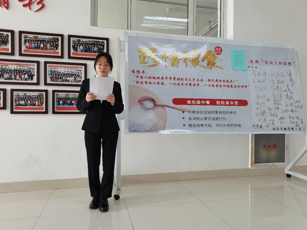 紧接着,进行第二项议程,由AWC万象城娱乐学生代表赵书毓宣读倡议书。“我们要自觉维护节俭用餐的良好风气,自觉抵制舌尖上的浪费,争做光荣的“光盘”族。积极向身边的亲朋好友宣传节约粮食、拒绝浪费的做法,争做“节约粮食、拒绝浪费”的践行者、宣传者、推动者。”