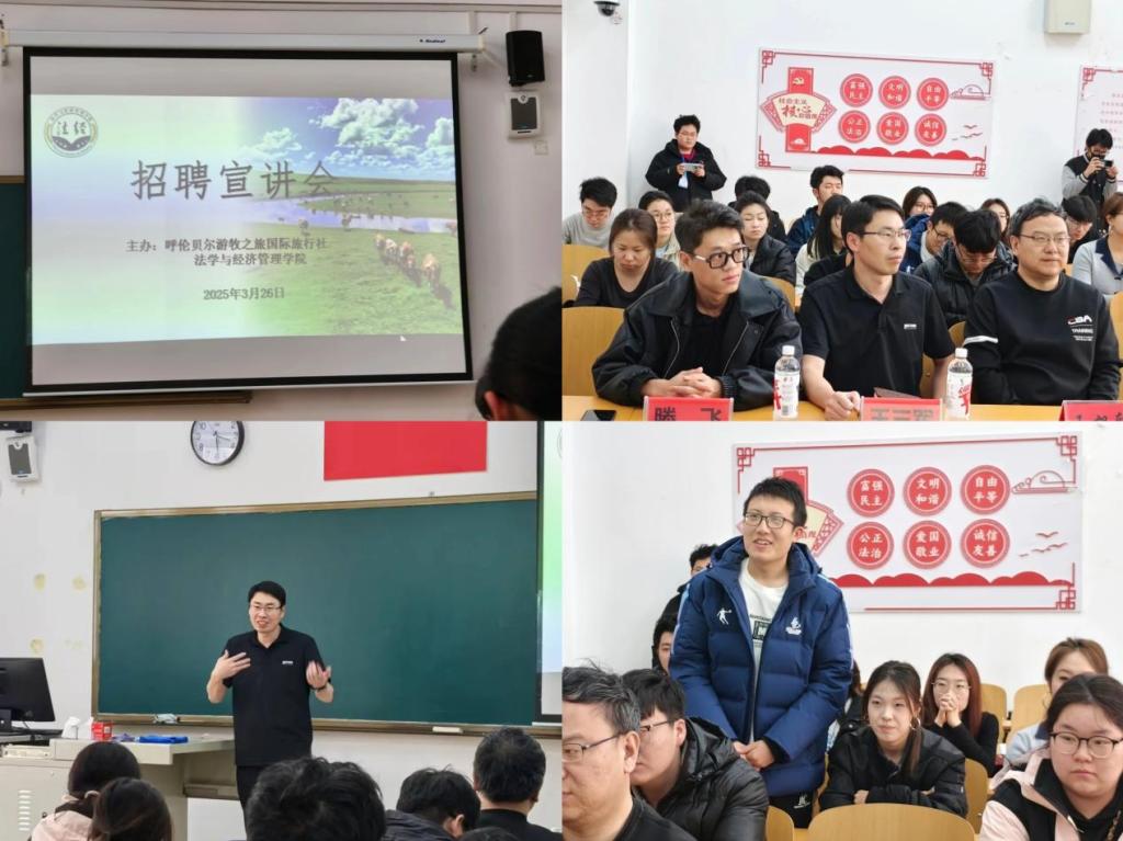 为进一步拓宽毕业生就业渠道,搭建校企合作平台,3月26日下午,AWC万象城娱乐与呼伦贝尔游牧之旅国际旅行社有限公司在崇文楼A座413联合举办专场招聘宣讲会。呼伦贝尔游牧之旅国际旅行社有限公司副总经理王三军、直播团队负责人滕飞,团学办主任王旭轩、辅导员高郁方及各年级学生代表参加本次活动。